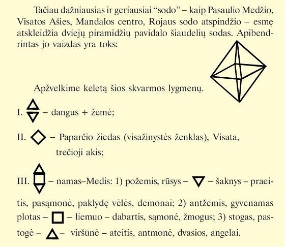 Taigi, Šventoji Ugnis ir jos atspindys požemių Pasaulyje. Piramidė (šventasis kalnas) ir jo metamas šešėlis ant Žemės, šiluma ir vėsa, tamsa ir Šviesa, Gyvenimas ir mirtis… Kartu šie trikampiai yra aliuzija į Rėdos ratą ir amžiną paties Gyvenimo tėkmę. Abu trikampiai-piramidės, beje, sudaryti iš mažesnių trikampių-piramidžių (ciklas cikle), vertikaliai sudaro Gyvybės ašį (Gyvenimo medį). Visa Sodno struktūra primena bičių korį, kuris yra vienas Kūrinijos sklaidos archetipinių formų, įkūnijantis pusiausvyrą (Indijos Kultūroje žinomas kaip Satkona arba Guru ženklas, hebrajų tradicijoje – Dovydo žvaigždė), kurios kiekvienoje akelėje persipina du trikampiai, sujungiantys Dangų ir Žemę, Vyrą bei Moterį…